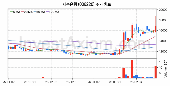 제주은행 (주식 종목 코드 : 006220) 주가 분석 내용의 기준 시점은 2026년 02월 20일이며, 분석 기준 시점으로부터의 주가 흐름 및 거래량 데이터를 바탕으로 분석 한 내용입니다.