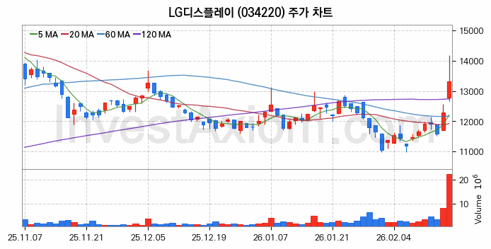 LG디스플레이 (주식 종목 코드 : 034220) 주가 분석 내용의 기준 시점은 2026년 02월 20일이며, 분석 기준 시점으로부터의 주가 흐름 및 거래량 데이터를 바탕으로 분석 한 내용입니다.