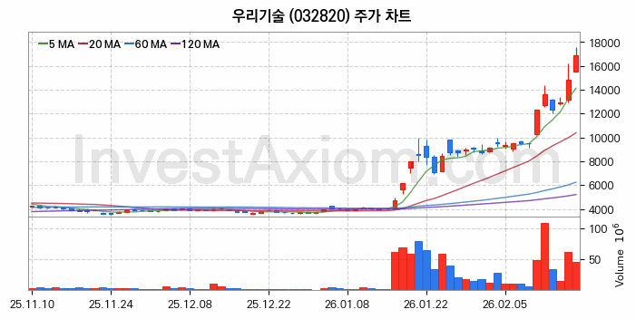 우리기술 (주식 종목 코드 : 032820) 주가 분석 내용의 기준 시점은 2026년 02월 23일이며, 분석 기준 시점으로부터의 주가 흐름 및 거래량 데이터를 바탕으로 분석 한 내용입니다.