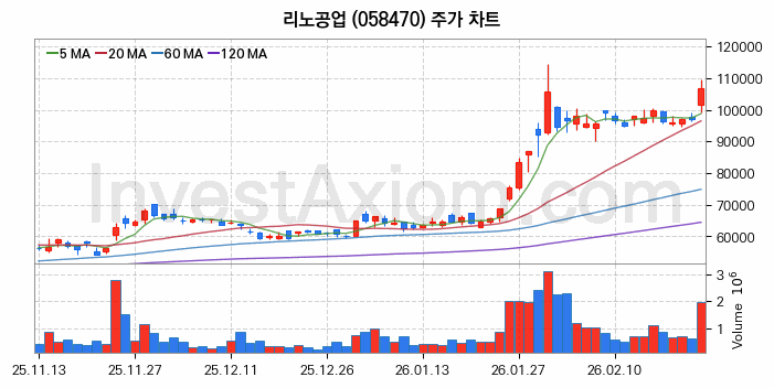 리노공업 (주식 종목 코드 : 058470) 주가 분석 내용의 기준 시점은 2026년 02월 26일이며, 분석 기준 시점으로부터의 주가 흐름 및 거래량 데이터를 바탕으로 분석 한 내용입니다.