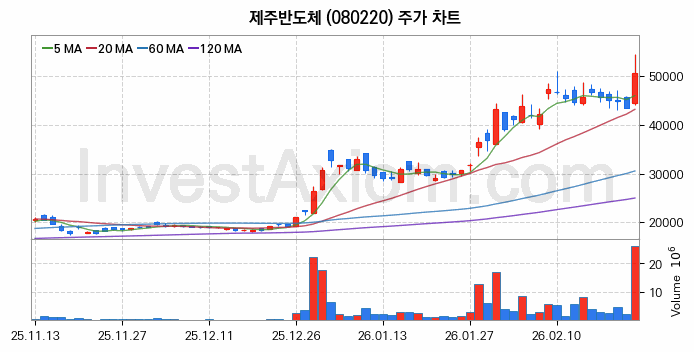 제주반도체 (주식 종목 코드 : 080220) 주가 분석 내용의 기준 시점은 2026년 02월 26일이며, 분석 기준 시점으로부터의 주가 흐름 및 거래량 데이터를 바탕으로 분석 한 내용입니다.