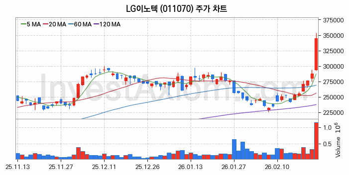 LG이노텍 (주식 종목 코드 : 011070) 주가 분석 내용의 기준 시점은 2026년 02월 26일이며, 분석 기준 시점으로부터의 주가 흐름 및 거래량 데이터를 바탕으로 분석 한 내용입니다.