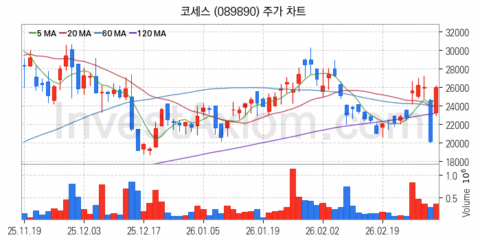 코세스(089890) 종목은 시가 23,250원으로 시작해 26,000원으로 마감했습니다.