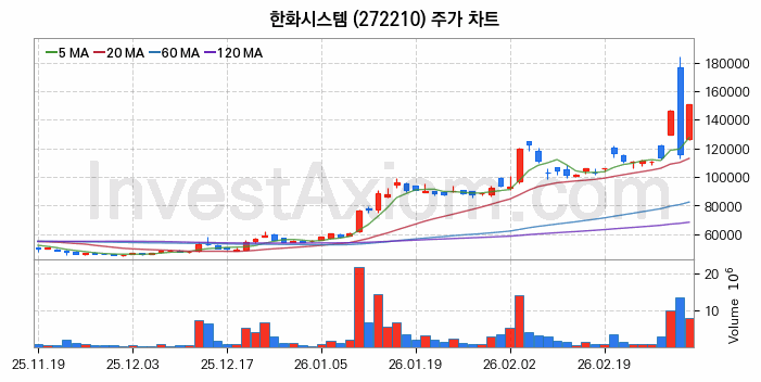 2026년 03월 05일, 한화시스템 주식 종목(272210)의 주가는 전일(116000원) 대비 34800원(약 30.0%) 상승한 150800원입니다.