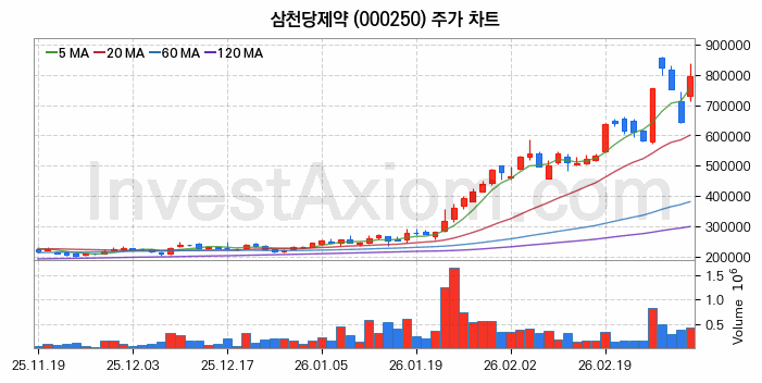 삼천당제약 주가는 주 단위 첫 거래일인 2026년 03월 03일을 기준으로 주초 주가 754000원 대비 약 5.57% 42000원 상승한 상태입니다.