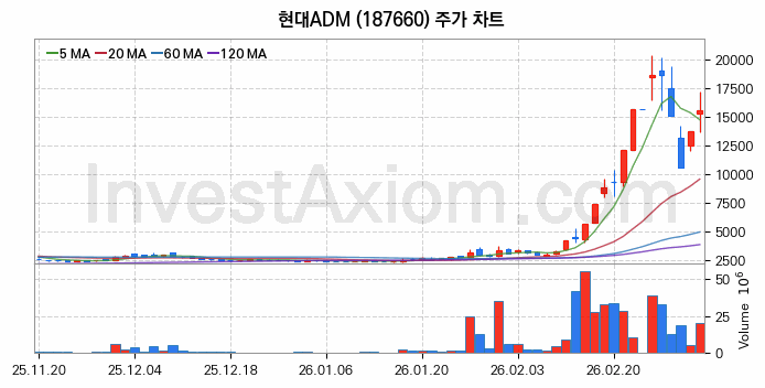 현대ADM (주식 종목 코드 : 187660) 주가 분석 내용의 기준 시점은 2026년 03월 06일이며, 분석 기준 시점으로부터의 주가 흐름 및 거래량 데이터를 바탕으로 분석 한 내용입니다.