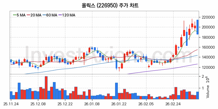올릭스 (주식 종목 코드 : 226950) 주가 분석 내용의 기준 시점은 2026년 03월 10일이며, 분석 기준 시점으로부터의 주가 흐름 및 거래량 데이터를 바탕으로 분석 한 내용입니다.