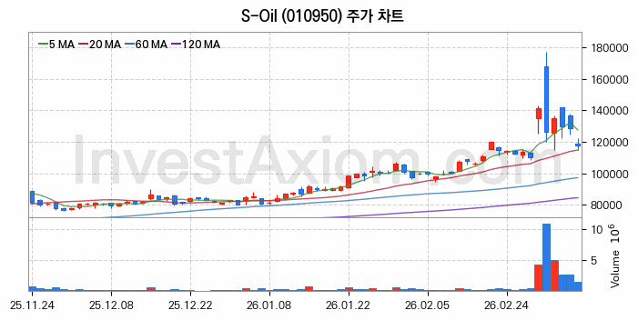 S-Oil (주식 종목 코드 : 010950) 주가 분석 내용의 기준 시점은 2026년 03월 10일이며, 분석 기준 시점으로부터의 주가 흐름 및 거래량 데이터를 바탕으로 분석 한 내용입니다.
