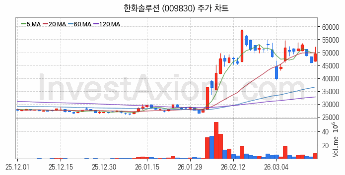 한화솔루션(009830) 종목은 시가 46,650원으로 시작해 49,450원으로 마감했습니다.
