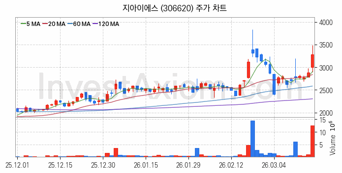 지아이에스(306620) 종목은 시가 3,000원으로 시작해 3,280원으로 마감했습니다.