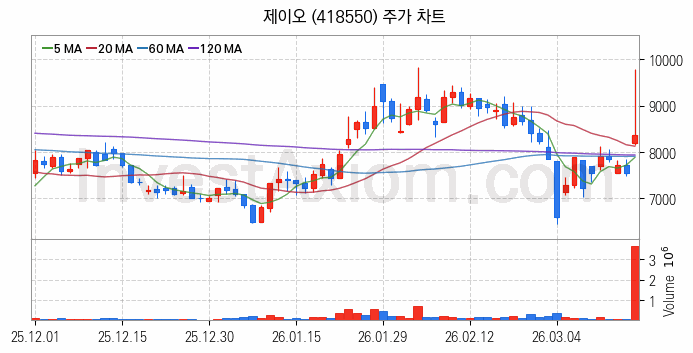 제이오(418550) 종목은 시가 8,190원으로 시작해 8,380원으로 마감했습니다.