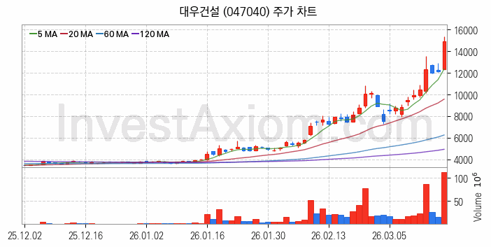 대우건설(047040) 종목은 시가 12,320원으로 시작해 14,870원으로 마감했습니다.