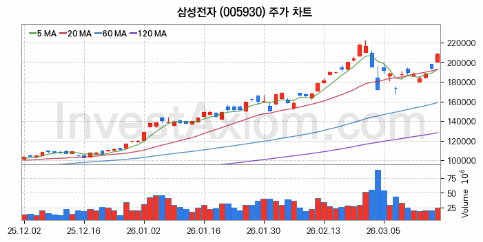 분석 종목 주가는 3월 첫 거래일인 2026년 03월 03일을 기준으로 월초 주가 195100원 대비 약 6.87% 13400원 상승한 상태입니다.