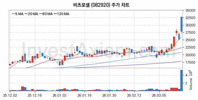 비츠로셀의 시가는 32750원이며, 전일 종가인 25200원 대비 7550원에 해당하는 29.96% 상승하며 주식 거래를 시작했습니다.