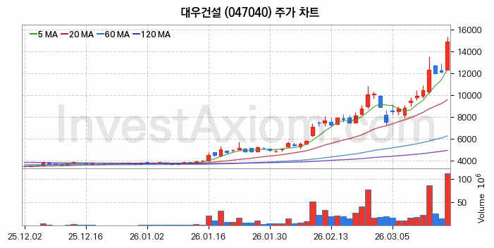 대우건설 (주식 종목 코드 : 047040) 주가 분석 내용의 기준 시점은 2026년 03월 18일이며, 분석 기준 시점으로부터의 주가 흐름 및 거래량 데이터를 바탕으로 분석 한 내용입니다.