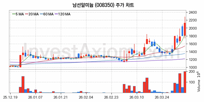 2026년 04월 06일, 남선알미늄 주식 종목(008350)의 주가는 전일(1805원) 대비 325원(약 18.01%) 상승한 2130원입니다.