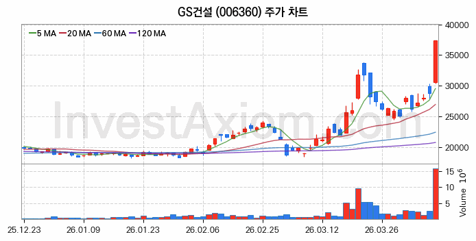 GS건설 주가는 주 단위 첫 거래일인 2026년 04월 06일을 기준으로 주초 주가 28000원 대비 약 33.57% 9400원 상승한 상태입니다.