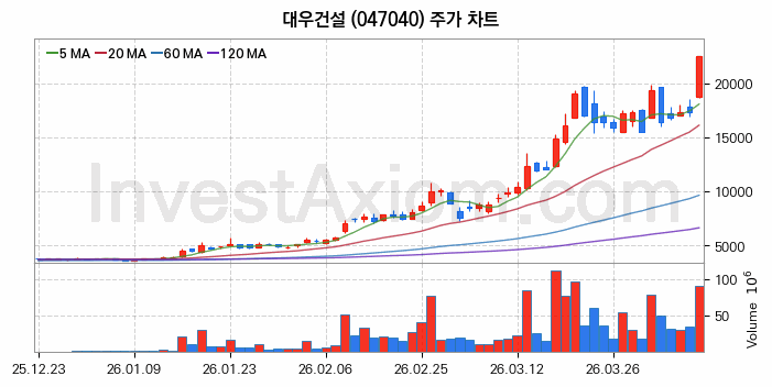 2026년 04월 08일, 대우건설 주식 종목(047040)의 주가는 전일(17350원) 대비 5200원(약 29.97%) 상승한 22550원입니다.