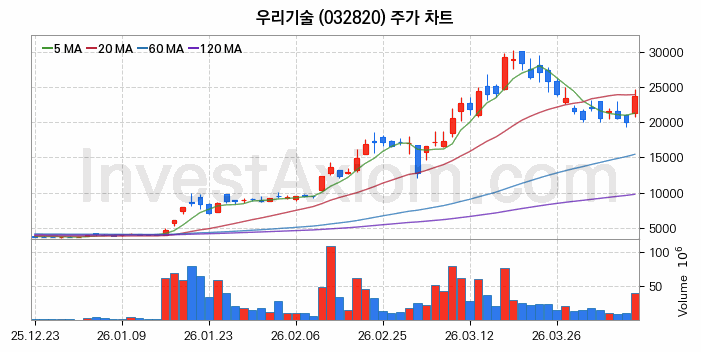 우리기술 (주식 종목 코드 : 032820) 주가 분석 내용의 기준 시점은 2026년 04월 08일이며, 분석 기준 시점으로부터의 주가 흐름 및 거래량 데이터를 바탕으로 분석 한 내용입니다.