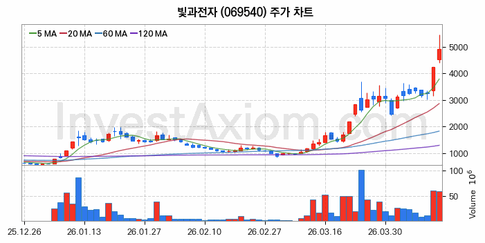빛과전자 (주식 종목 코드 : 069540) 주가 분석 내용의 기준 시점은 2026년 04월 10일이며, 분석 기준 시점으로부터의 주가 흐름 및 거래량 데이터를 바탕으로 분석 한 내용입니다.