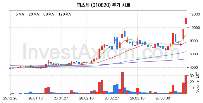 퍼스텍 (주식 종목 코드 : 010820) 주가 분석 내용의 기준 시점은 2026년 04월 10일이며, 분석 기준 시점으로부터의 주가 흐름 및 거래량 데이터를 바탕으로 분석 한 내용입니다.