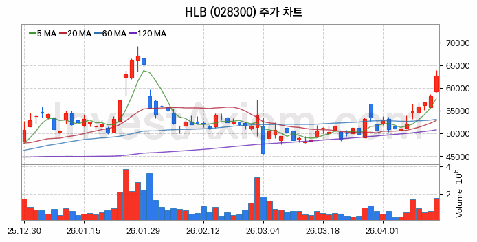 HLB (주식 종목 코드 : 028300) 주가 분석 내용의 기준 시점은 2026년 04월 14일이며, 분석 기준 시점으로부터의 주가 흐름 및 거래량 데이터를 바탕으로 분석 한 내용입니다.
