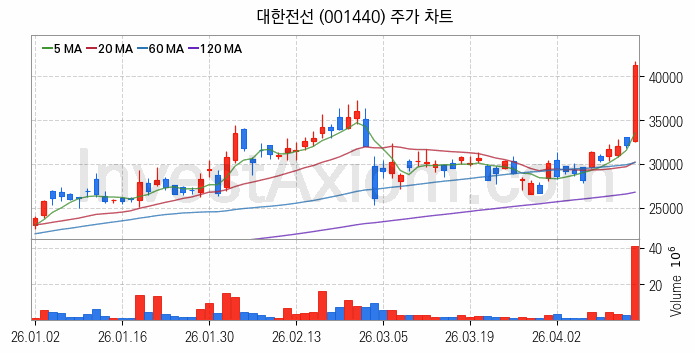 대한전선(001440) 종목은 시가 32,600원으로 시작해 41,250원으로 마감했습니다.