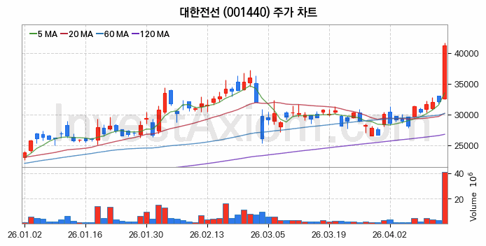 2026년 04월 15일, 대한전선 주식 종목(001440)의 주가는 전일(32150원) 대비 9100원(약 28.3%) 상승한 41250원입니다.
