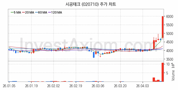 시공테크(020710) 종목은 시가 4,750원으로 시작해 5,990원으로 마감했습니다.