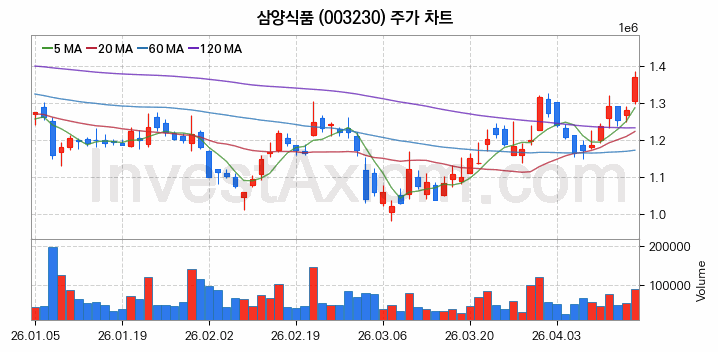 삼양식품 (주식 종목 코드 : 003230) 주가 분석 내용의 기준 시점은 2026년 04월 16일이며, 분석 기준 시점으로부터의 주가 흐름 및 거래량 데이터를 바탕으로 분석 한 내용입니다.