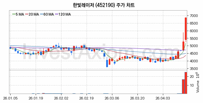 한빛레이저 (주식 종목 코드 : 452190) 주가 분석 내용의 기준 시점은 2026년 04월 16일이며, 분석 기준 시점으로부터의 주가 흐름 및 거래량 데이터를 바탕으로 분석 한 내용입니다.