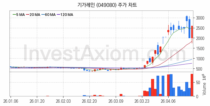 기가레인(049080) 종목은 시가 2,010원으로 시작해 2,600원으로 마감했습니다.