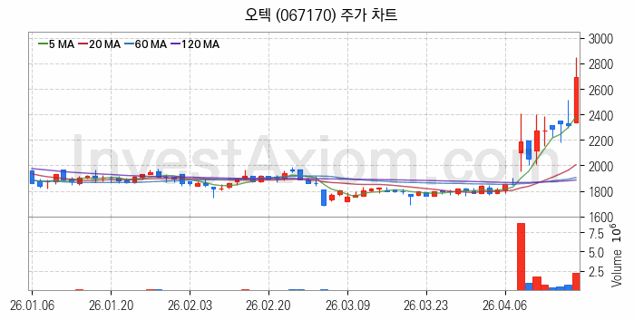 오텍(067170) 종목은 시가 2,335원으로 시작해 2,695원으로 마감했습니다.