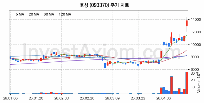 후성 (주식 종목 코드 : 093370) 주가 분석 내용의 기준 시점은 2026년 04월 17일이며, 분석 기준 시점으로부터의 주가 흐름 및 거래량 데이터를 바탕으로 분석 한 내용입니다.