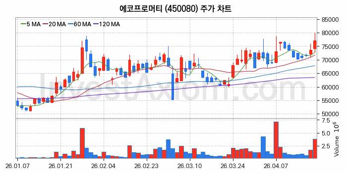 2026년 04월 20일, 에코프로머티 주식 종목(450080)의 주가는 전일(73700원) 대비 3400원(약 4.61%) 상승한 77100원입니다.