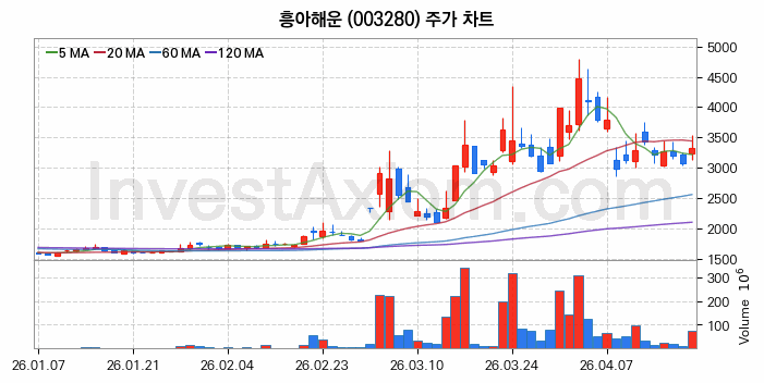 흥아해운 (주식 종목 코드 : 003280) 주가 분석 내용의 기준 시점은 2026년 04월 20일이며, 분석 기준 시점으로부터의 주가 흐름 및 거래량 데이터를 바탕으로 분석 한 내용입니다.