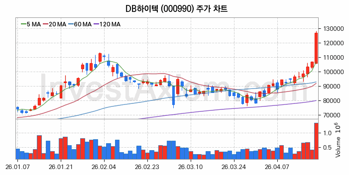 DB하이텍 (주식 종목 코드 : 000990) 주가 분석 내용의 기준 시점은 2026년 04월 20일이며, 분석 기준 시점으로부터의 주가 흐름 및 거래량 데이터를 바탕으로 분석 한 내용입니다.