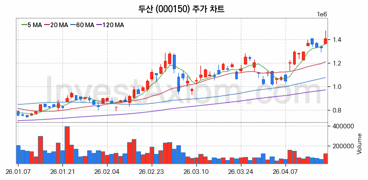 두산 (주식 종목 코드 : 000150) 주가 분석 내용의 기준 시점은 2026년 04월 20일이며, 분석 기준 시점으로부터의 주가 흐름 및 거래량 데이터를 바탕으로 분석 한 내용입니다.