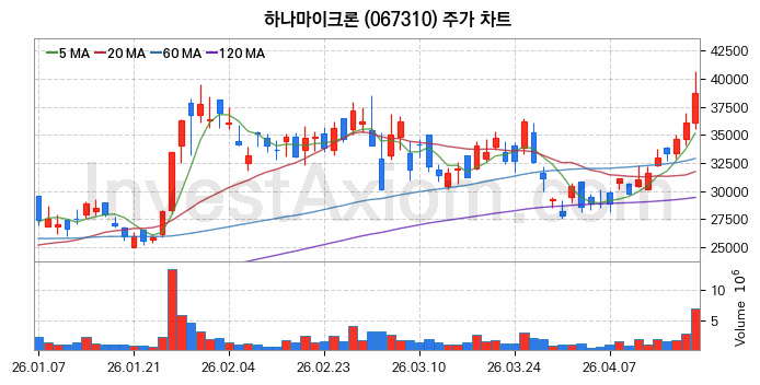 2026년 04월 20일, 하나마이크론 주식 종목(067310)의 주가는 전일(36050원) 대비 2650원(약 7.35%) 상승한 38700원입니다.