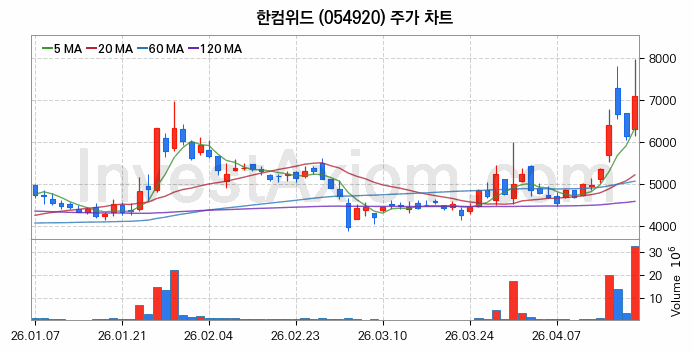한컴위드 (주식 종목 코드 : 054920) 주가 분석 내용의 기준 시점은 2026년 04월 20일이며, 분석 기준 시점으로부터의 주가 흐름 및 거래량 데이터를 바탕으로 분석 한 내용입니다.
