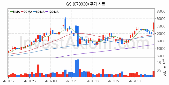 GS(078930) 종목은 시가 72,900원으로 시작해 76,800원으로 마감했습니다.