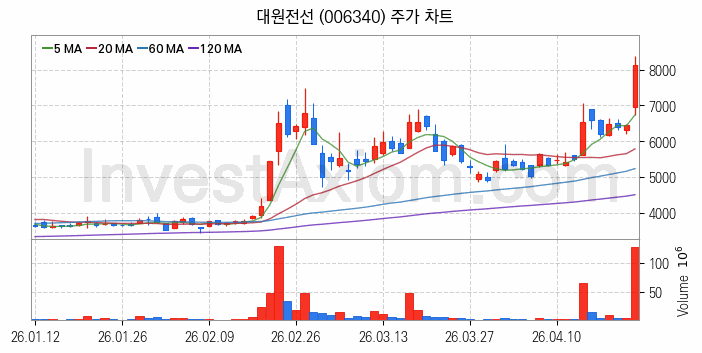 대원전선(006340) 종목은 시가 6,940원으로 시작해 8,140원으로 마감했습니다.