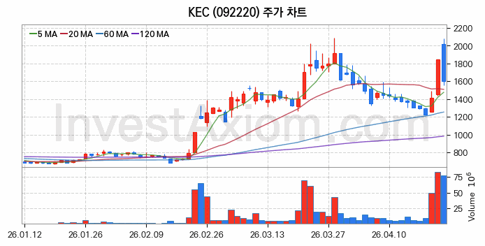 KEC (주식 종목 코드 : 092220) 주가 분석 내용의 기준 시점은 2026년 04월 23일이며, 분석 기준 시점으로부터의 주가 흐름 및 거래량 데이터를 바탕으로 분석 한 내용입니다.