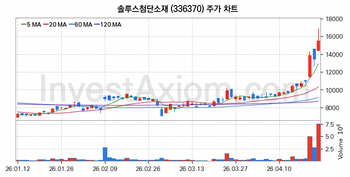 솔루스첨단소재 (주식 종목 코드 : 336370) 주가 분석 내용의 기준 시점은 2026년 04월 23일이며, 분석 기준 시점으로부터의 주가 흐름 및 거래량 데이터를 바탕으로 분석 한 내용입니다.