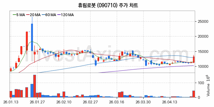 휴림로봇 (주식 종목 코드 : 090710) 주가 분석 내용의 기준 시점은 2026년 04월 24일이며, 분석 기준 시점으로부터의 주가 흐름 및 거래량 데이터를 바탕으로 분석 한 내용입니다.