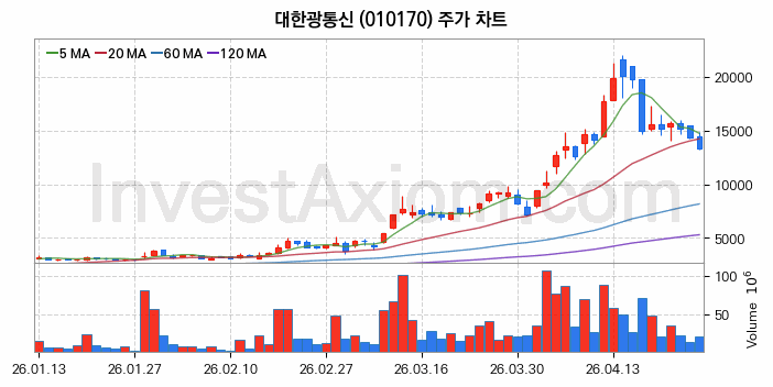대한광통신 (주식 종목 코드 : 010170) 주가 분석 내용의 기준 시점은 2026년 04월 24일이며, 분석 기준 시점으로부터의 주가 흐름 및 거래량 데이터를 바탕으로 분석 한 내용입니다.