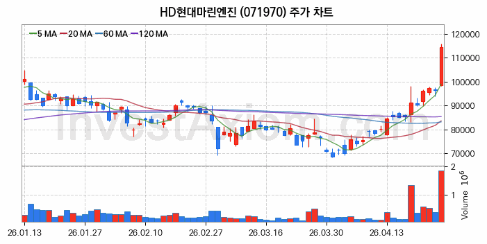 2026년 04월 24일, HD현대마린엔진 주식 종목(071970)의 주가는 전일(96400원) 대비 18200원(약 18.88%) 상승한 114600원입니다.