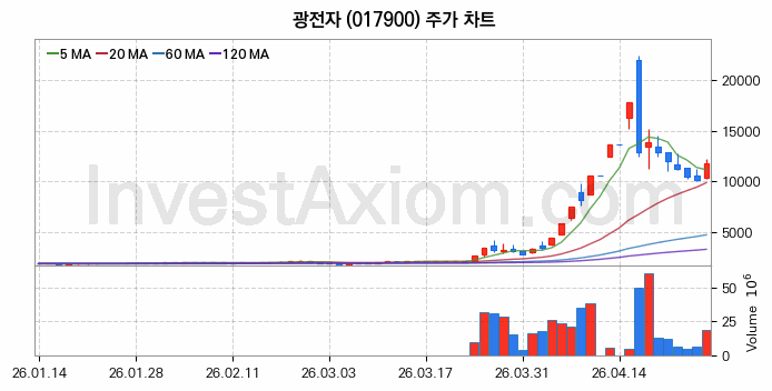 광전자 (주식 종목 코드 : 017900) 주가 분석 내용의 기준 시점은 2026년 04월 27일이며, 분석 기준 시점으로부터의 주가 흐름 및 거래량 데이터를 바탕으로 분석 한 내용입니다.
