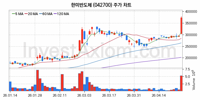 2026년 04월 27일, 한미반도체 주식 종목(042700)의 주가는 전일(295500원) 대비 78000원(약 26.4%) 상승한 373500원입니다.