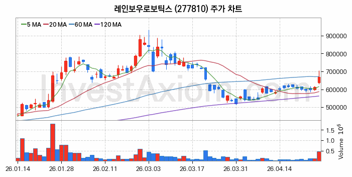 레인보우로보틱스 (주식 종목 코드 : 277810) 주가 분석 내용의 기준 시점은 2026년 04월 27일이며, 분석 기준 시점으로부터의 주가 흐름 및 거래량 데이터를 바탕으로 분석 한 내용입니다.